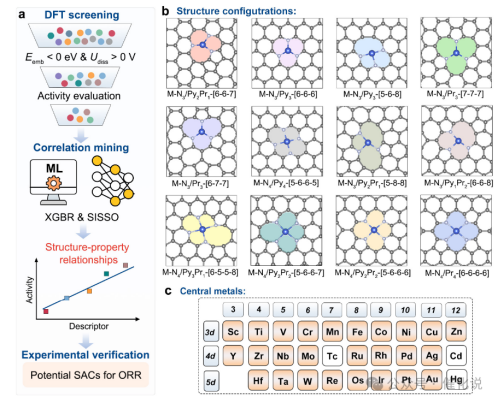 近日,我校张山青教授团队联合澳大利亚同步辐射中心和香港城市大学在单原子电催化剂设计领域取得新进展,提出了一种机器学习指导的配位工程策略,精准调控M-N-C单原子催化剂的局部配位结构,实现了高效氧还原反应(ORR)。通过结合密度泛函理论计算与机器学习算法,团队解析了312种M-N-C单原子催化剂模型的构效关系,并发现了一个低维可解释描述符Eemb/sin(CN)(其中Eemb为金属嵌入能,CN为配位数),为理性设计高性能电催化剂提供了新范式。相关成果发表于国际化学领域顶级期刊《Journal of the American Chemical Society》,色情直播平台