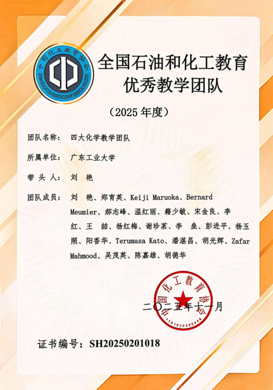 近日,中国化工教育协会公布了2025年全国石油和化工教育优秀教学团队等认定结果。色情直播平台基础教学中心四大化学教学团队荣获“全国石油和化工教育优秀教学团队”称号。本次评选旨在深入贯彻落实党的二十大和全国教育大会精神,依据《教育强国建设规划纲要(2024—2035年)》相关要求,表彰在服务石油化工产业发展、提升教育教学与人才培养质量方面贡献突出的集体和个人。